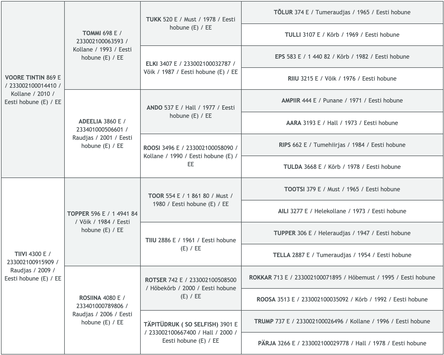 Tihvani ema ja ühtlasi Teni ema Tiivi430E (isa Topper 596E, ema Rosiina 4080E, emaisa Rotser 742E) on sündinud 31.03.2009, raudjas mära, turja kõrgusega 144 cm. Tiivi saavutas 2012. aastal EHSi eesti tõugu noorhobuste üleriigilistel jõudluskatsetel I auhinna. Tiivi annab oma varssadele edasi oma suurepärast iseloomu. Tiivi sugupuust veel niipalju, et tema Saaremaalt Tõllustest pärit isa Topper käis nii adra kui ree ees, sobis ratsutamiseks algajatelegi ning sai 1999. aastal kuulsaks sellega, et tema hooleks usaldati laulupeotule vedamine. Topper paistis silma väga erilise tumevõigu värvusega. Pole võimatu, et mõni Tiivi või Tihvani järeltulijaist selle värvuse taas meie ette toob! Põnevaid värvusi kannab see mära oma vereliinides kaasas veelgi: Tiivi emaisa Rotser oli hõbegeeniga kõrb ja omakorda tema isa, kuulus Rokkar 713E oli hõbemust, müstilise hõbedase saba ja lakaga säravmust täkk. Saarlased ütlesid vanasti sellise värvuse kohta “Kärla sinine”, see nimi tulenes kohast Saaremaal, kus seda värvi hobuseid kõige enam sündis. Täiesti ebamaine värvus!